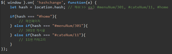 만약 hash값이 #home이면 메인페이지로 넘어가고 hash값이 menuNum/301이면 301번 게시글로
