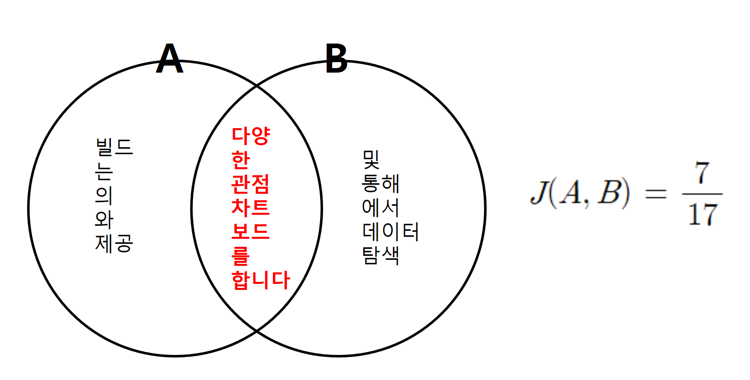 문장을 단어 토큰(token)으로 나누고, 공통된 단어의 수를 전체 단어 수로 나눠서 계산합니다.